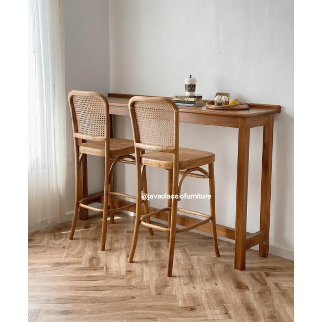 1SET KURSI MEJA BAR CAFE RESTORANT RETRO ROTAN MINIMALIS VINTAGE KAYU JATI TUA GRADE A FINISHING NATURAL DOFF FURNITURE JEPARA