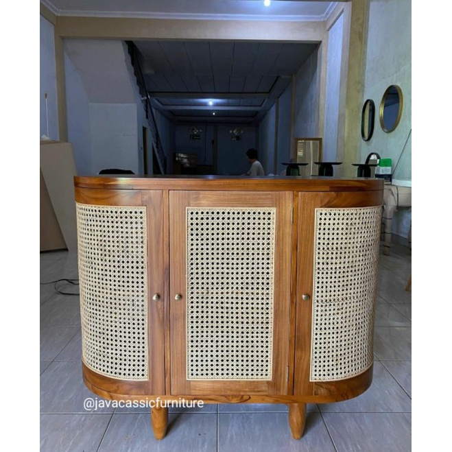 BUFET RETRO ROTAN MINIMALIS BENTUK OVAL BAHAN KAYU JATI FINISHING NATURAL UKURAN 120x90cm