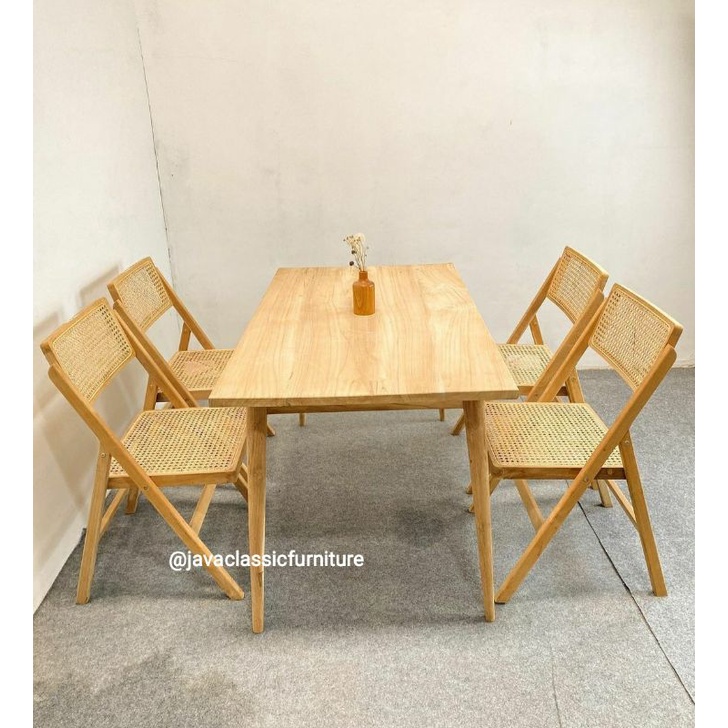 1 SET KURSI MEJA MAKAN CAFE MINIMALIS ROTAN VINTAGE BAHAN KAYU JATI FINISHING BLEACHING DINNING CHAIR