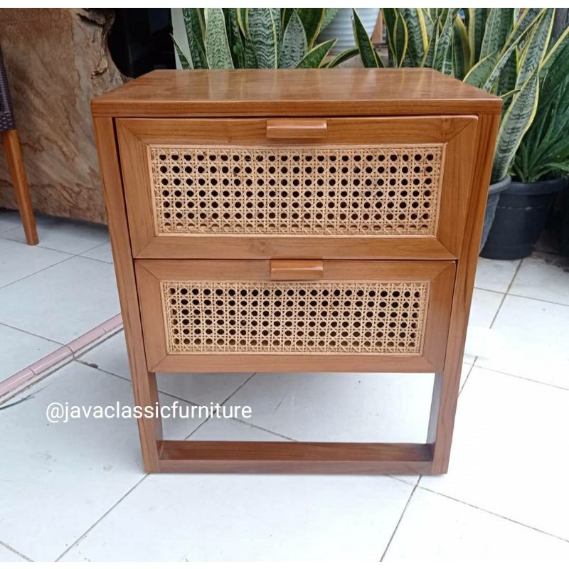 NAKAS RETRO ROTAN MINIMALIS PUK VINTAGE LACI 2 BAHAN KAYU JATI UKURAN 40x50x60cm
