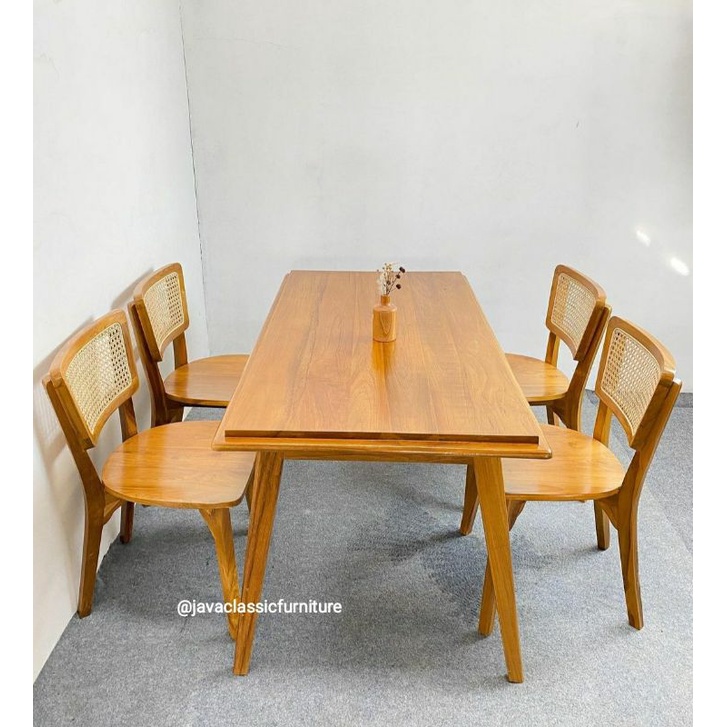 1 SET KURSI MAKAN CAFE ROTAN RETRO MINIMALIS MEJA KOTAK RESTO BAR DINNING CHAIR COFFE TABLE BAHAN KAYU JATI FINISHING NATURAL VINTAGE MEBEL FURNITURE JEPARA