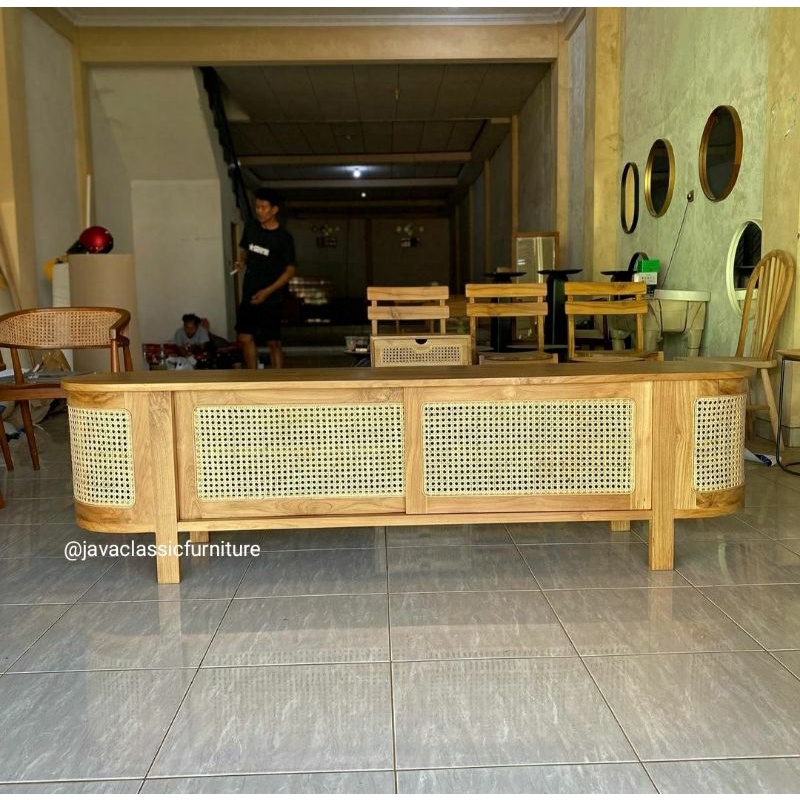 BUFET TV CUSTOM ROTAN MEJA CABINET OVAL BAHAN KAYU JATI PANJANG 2 METER